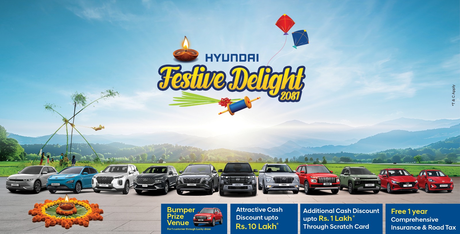 हुन्डार्ड फेष्टिभ डिलाइट २०८१ अन्तर्गत कुनैपनि हुन्डाई गाडीको खरीदमा रु. १० लाख सम्मको आकर्षक नगद छुट, स्क्राच कार्ड मार्फत थप रु.१ लाख सम्मको नगद छुटका साथै १ वर्षको लागि निःशुल्क सवारी वीमा तथा सवारी कर सुविधा पनि प्राप्त गर्न सक्नेछन् । आफ्ना ग्राहकहरुको सन्तुष्टिको निमित्त हुन्डाईले सदैव समय सापेक्षिक ग्राहक लक्षित योजनाहरु सार्वजनिक गर्दै आइरहेको छ ।