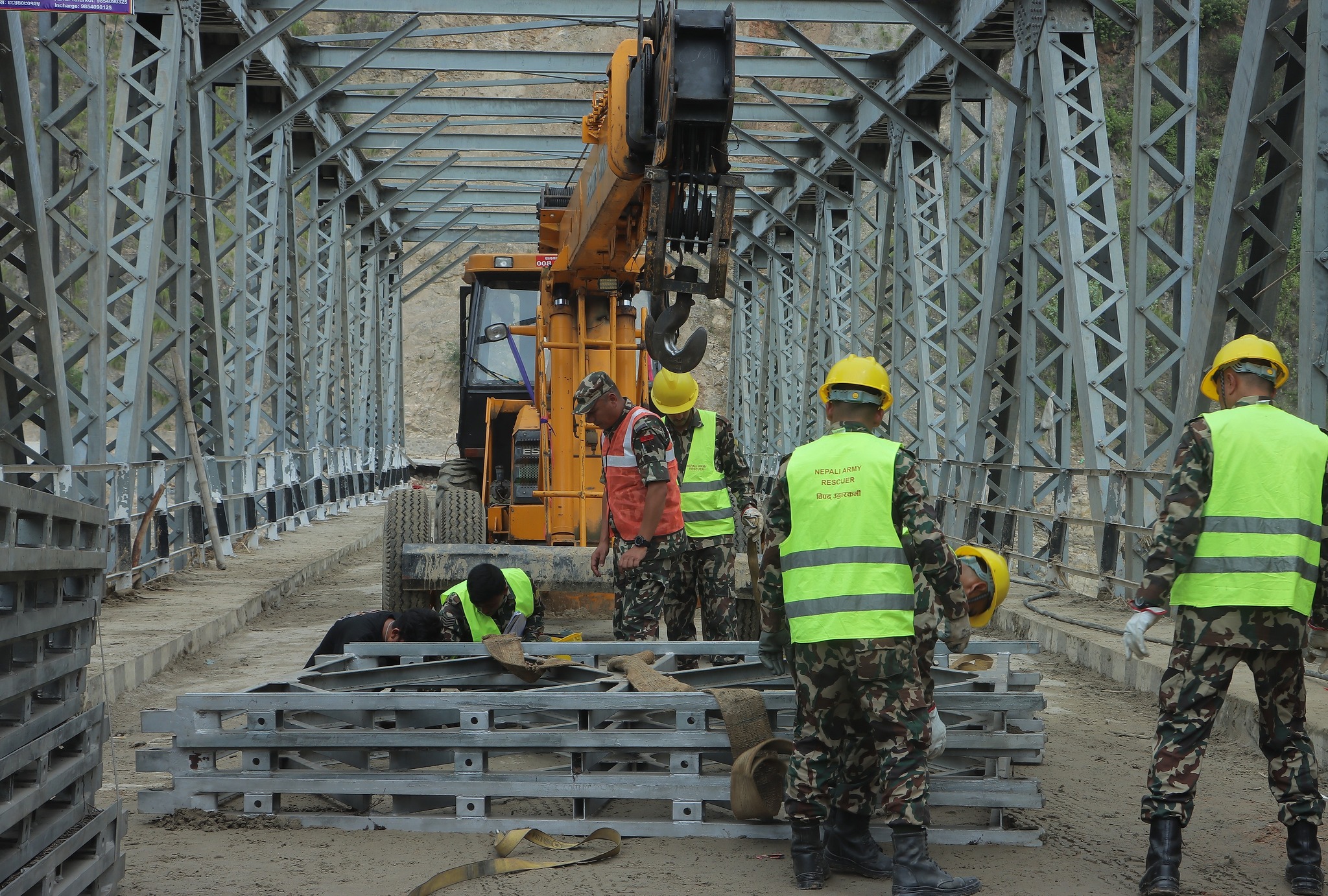सुनकोशी नदीको मोटरेवल पुल बाढीले बगाएपछि तत्काल यातायातका साधन सञ्चालन गर्ने गरी नेपाली सेनाले बेलिब्रिज पुल निर्माण थालेको हो। बेलिब्रिज निर्माणका लागि पाँच वटा ट्रकमा शुक्रबार नै निर्माण सामाग्री खुर्कोट ल्याएको छ। शुक्रबार नेपाली सेनाले हेलिकोप्टरद्वारा सर्वेक्षण गरेपनि शनिबारबाट नेपाली सेनाको प्राविधिकसहितको टोलीले सुनकोशी नदीमा बेलिब्रिज निर्माण थालेको हो।