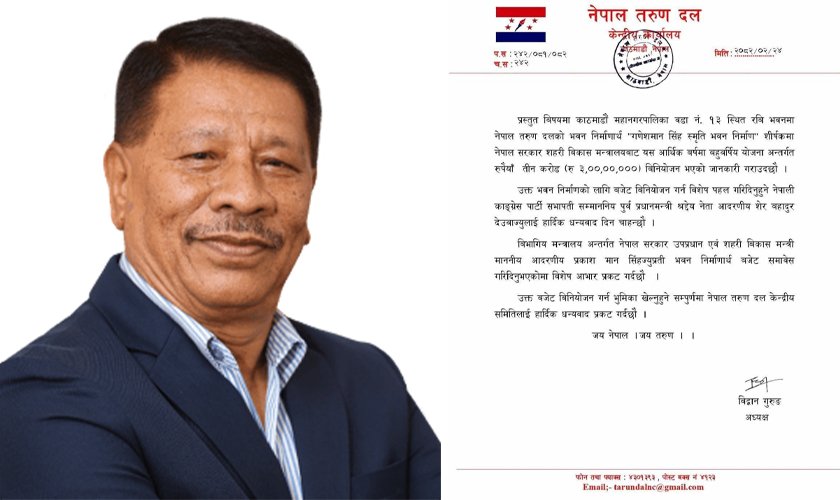 सरकारले सत्तारुढ नेपाली कांग्रेसनिकट नेपाल तरुण दलको भवन बनाउन तीन करोड विनियोजन गरेको पाइएको छ । काठमाडौँ महानगरपालिका १३ स्थित रवि भवनमा तरुण दलको भवन निर्माणार्थ ‘गणेशमान सिंह स्मृति भवन निर्माण’ शीर्षकमा बजेट विनियोजन गरिएको सार्वजनिक भएपछि सामाजिक सञ्जालमा आलोचना भइरहेको छ ।