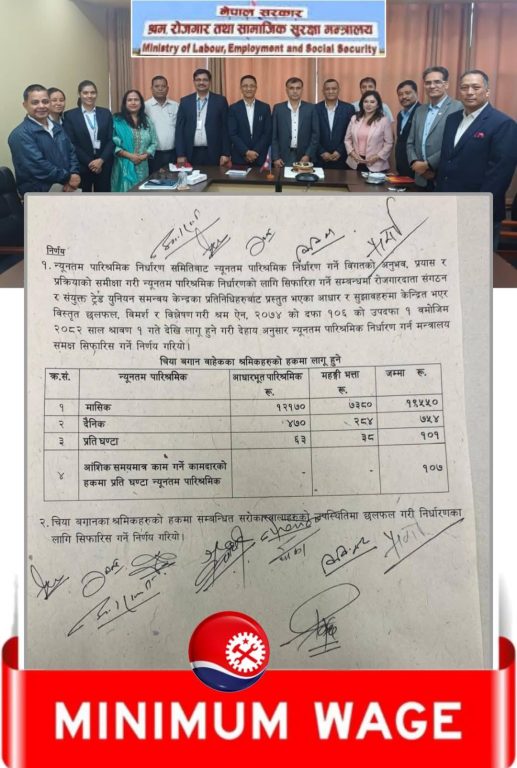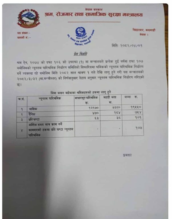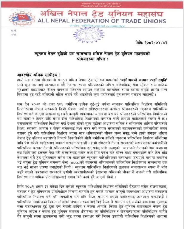नेकपा माओवादी केन्द्र निकट श्रमिकहरुको संगठन अखिल नेपाल ट्रेड युनियन महासंघले श्रमिकहरुको जीवन धान्न नै कठिन हुने किसिमले न्यूनतम पारिश्रमिक तोकिएको भन्दै विरोध जनाएको छ । सरकारले १ साउनदेखि लागु हुने गरी श्रमिकको न्यूनतम पारिश्रमिक १९ हजार ५५० रुपैयाँ निर्धारण गरेको छ । मजदुर संघ–संगठनका प्रतिनिधिहरुसँग समेत छलफल गरेपछि श्रम, रोजगार तथा सामाजिक सुरक्षा मन्त्रालयले साविकको १७ हजार ३०० रुपैयाँ न्यूनतम पारिश्रमिकमा २ हजार २५० रुपैयाँ थप गरी १९ हजार ५५० रुपैयाँ निर्धारण गरेको थियो ।